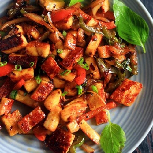 A Crispy yet soft pan fried tofu tossed in a super delicious sweet and spicy sauce with thai basil leaves. Perfect with jasmine rice, noodles. Ready in 20 minutes, vegan and can be easily made gluten free.