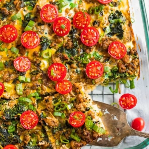 An easy Breakfast Casserole with spinach, sausage, eggs, and potatoes. It's SUPER yummy, healthy, and filling! Gluten free, dairy free, and Paleo.